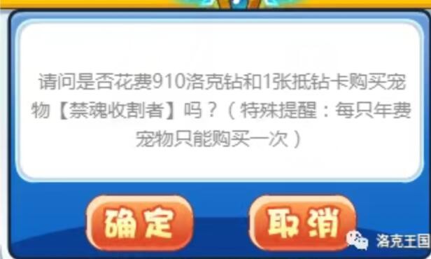 以小贝的图示为例,购买禁魂收割者需要930洛克钻, 点击[购买]后,若选择消耗1张抵钻卡,点击[确定]看到需要消耗910洛克钻和1张抵钻卡就能购买禁魂收割者啦。