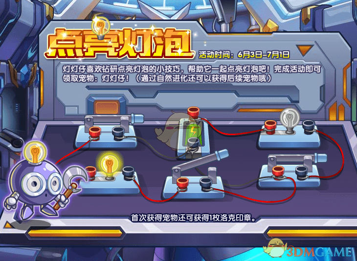 6月3日-7月1日期间,参与【点亮灯泡】活动,帮助灯灯仔一起点亮灯泡,完成活动即可领取宠物:灯灯仔。