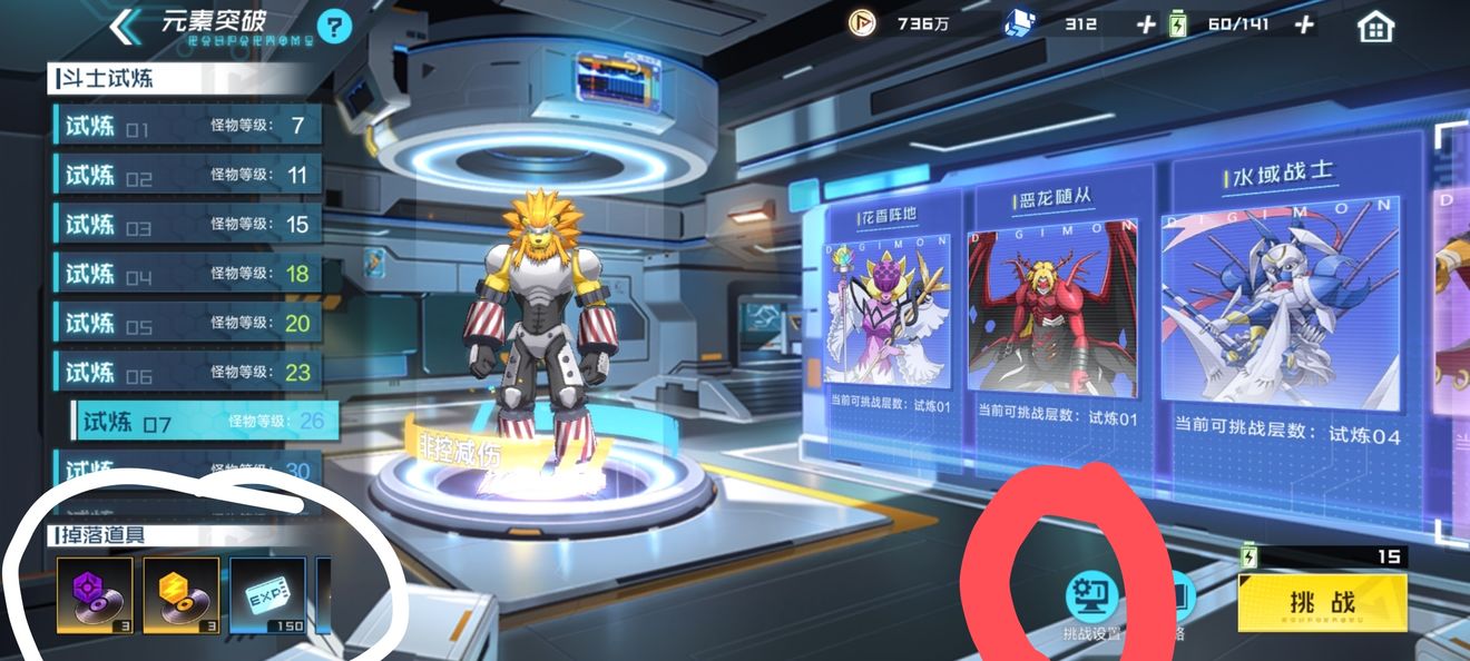 推荐方法:建议至少还是想办法弄到紫色插件(首充还是香...)属性碾压,或者也上阵一个狮子在1号位。最后,最好是到试炼8,因为到这里之后可以用挑战设置快速刷实验7(上图右下角红圈)