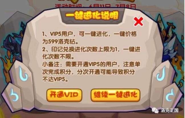 如果选择一键进化则需要VIP5 ,一键价格为599洛克钻(不限次数)。