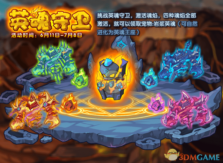 挑战英魂守卫,激活魂焰,四种魂焰全部激活,就可以领取宠物:岩浆英魂(可自然进化为英魂王座)。