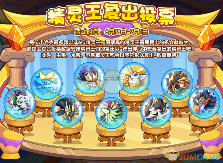 每位小洛克最多可以选择6位精灵王,得票高的精灵王暑期复出的机会就越大,选出你心中想要复出的精灵王吧!(此外,虫系、水系和电系精灵王会以其它形式复出~敬请期待!)