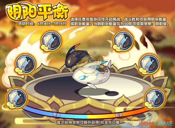 选择任意双鱼卦印可开启挑战,战斗胜利可获得阴卦能量或阳卦能量。当阴阳卦能量均为50即可领取宠物:阴阳鱼。