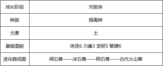 古代火山兽是病毒种族,可对数据种族造成额外15%伤害,但被疫苗种族克制,作为进攻方攻击时降低15%伤害。