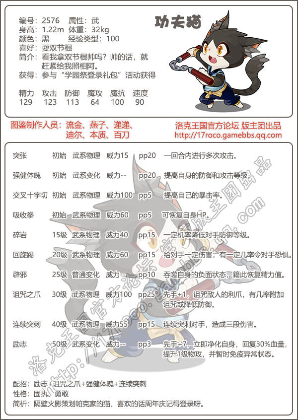 功夫猫洛克王国十一周年庆活动【学园祭登录礼包】获取的宠物,技能配招推荐:咕谊之爪+强键体筑+连续突刺。性格推荐:固执和勇敢。