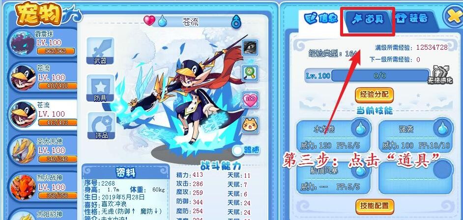 第三步:选择宠物以后,点击宠物详情页右侧界面上的“道具”选项。