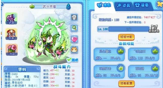 武斗灵猫由魔力猫超进化而来,性格主要推荐固执、开朗、勇敢。配招:主流一般是灵心慧念+飞花点石+幻想编织或者洞察打击+百花错。