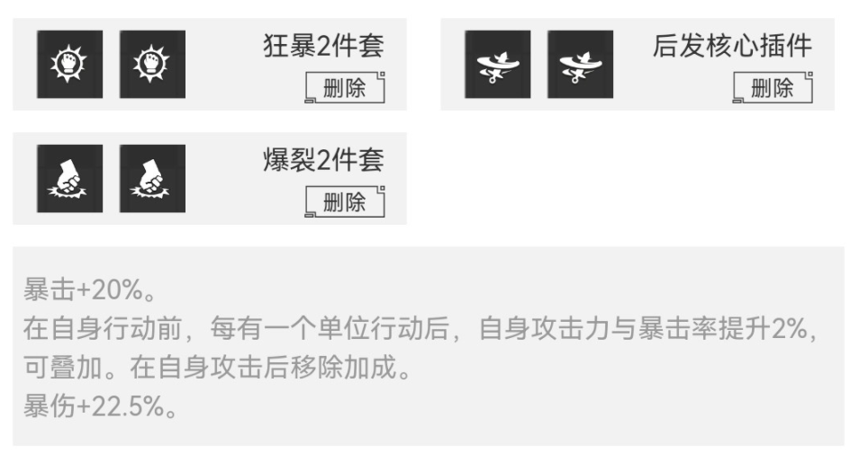 暴击加爆伤秒秒秒。一波流插件,需要把速度卡在对手收割手的前面,残血放大直接反杀。(有点赌狗成分,需要极高的练度)