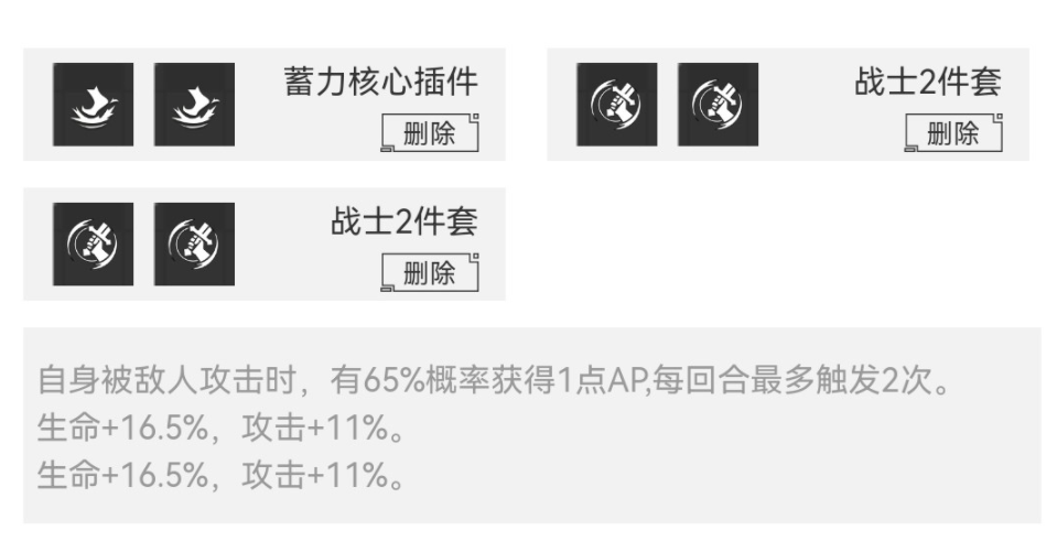 战士4件套,核心带蓄力插件。4战士又肉又有伤害,完美的配合帝皇龙甲兽的被动技能,蓄力核心在被攻击时提供ap,可以更快的叠加奥义伤害。(新版本最好用的搭配)