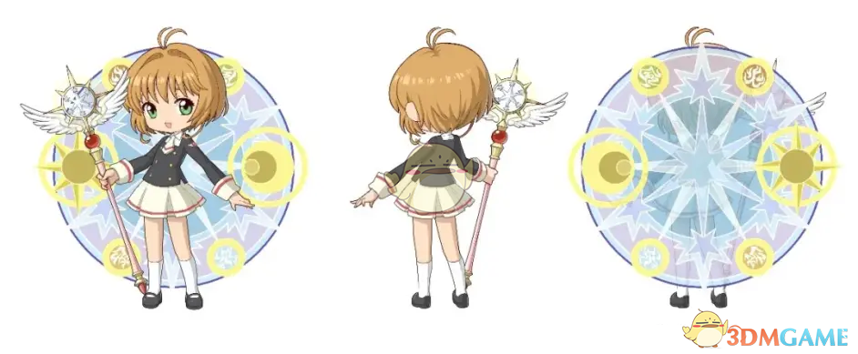 首先必须介绍我们的小樱!在这一次设计中,小樱穿着友枝中学的制服,手持着新法杖,身后也是新魔法阵,可谓焕然一新!成为中学生之后在小樱身边还是会有一些不可思议的事情发生,困难也很多,但小樱活泼的笑容依旧和大家记忆中的一样,真的太!可!爱!了