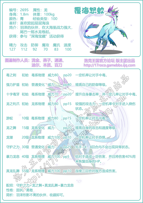 《洛克王国》覆海怒蛟宠物怎么样,厉害吗?《洛克王国》是一款轻松好玩的休闲类手游,Q萌的游戏画风,玩家将被置身于一个精彩的世界中,游戏中宠物角色非常多,下面小编就给大家带来了《洛克王国》覆海怒蛟技能配招图鉴介绍,一起看看吧!