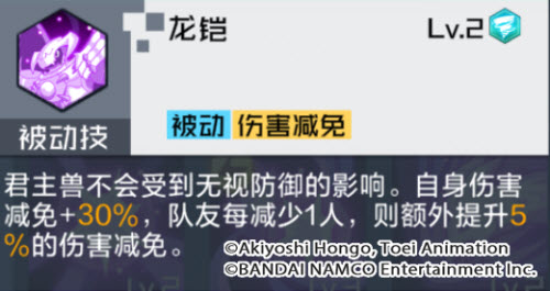 技能解析:自身不会受到无视防御效果的影响,并提升一定的伤害减免能力,我方的存活的队员越少,则伤害减免能力会进一步提升。