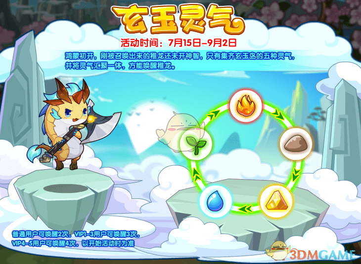 鸿蒙初开,刚被召唤出来的稚龙还未开神智,只有集齐玄玉岛的五种灵气,并将灵气汇聚一体,方能唤醒稚龙。