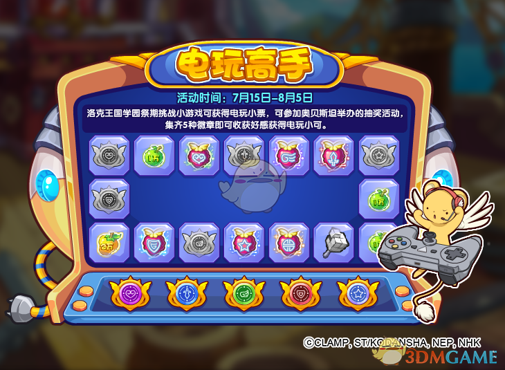 洛克王国学园祭期间挑战小游戏可获得电玩小票,可参加奥贝斯坦举办的抽奖活动,集齐5种徽章即可收获好感获得电玩小可。