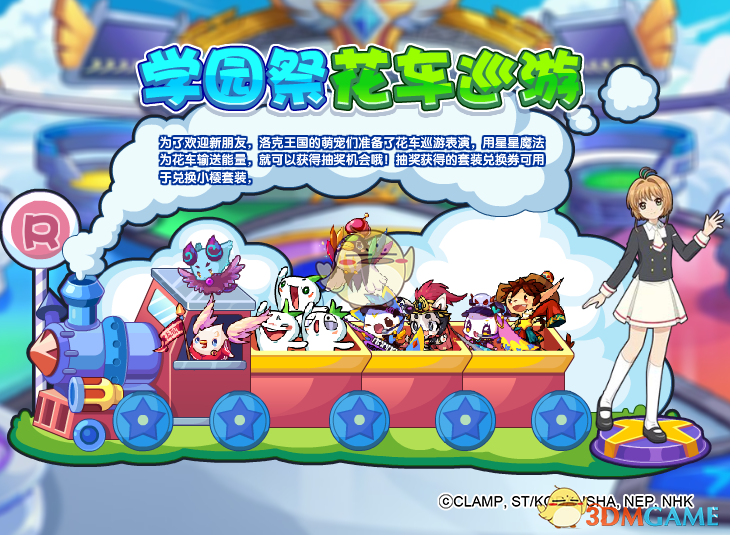 为了欢迎新朋友,洛克王国的萌宠们准备了花车巡游表演,用星星魔法为花车输送能量,就可以获得抽奖机会哦!抽奖获得的套装兑换券可用于兑换小樱友枝中学装扮。