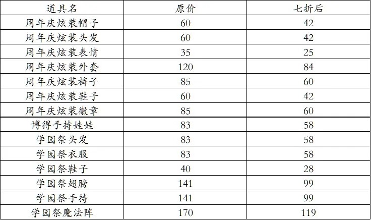 洛克王国十一周年庆纪念套装是学园祭服装,包含学园祭头发、衣服、鞋子、翅膀、手持和魔法阵,原价分别为:83,83,83,40,141,141,170,如果已经获得过暗雪莉·彼岸花,那么你就可以七折购买。