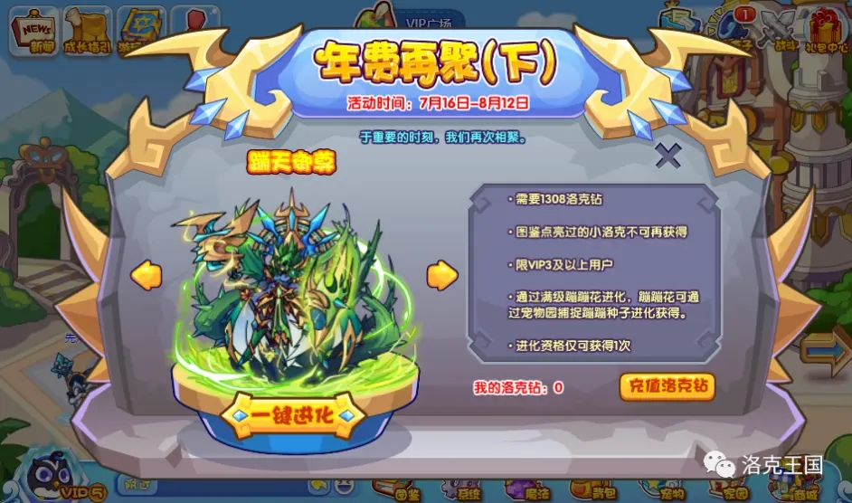 洛克王国十一周年庆期间,在vip广场参与年费再聚(下)活动,可以花费1308洛克钻获取,图鉴点亮过的不能重复获取。