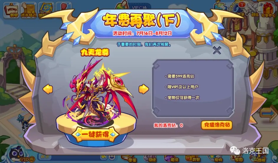 洛克王国十一周年庆期间,在vip广场参与年费再聚(下)活动,可以花费599洛克钻获取,VIP1及以上用户可以获取,仅限一次。