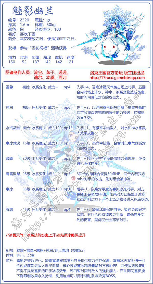 进化路线:大耳帽兜→帽兜娃娃→雪影娃娃→幽兰雪魅/魅影幽兰/雪影冰灵