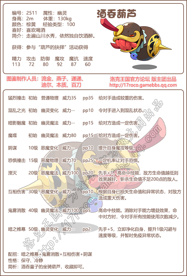 洛克王国酒吞葫芦怎么样,厉害吗?洛克王国手游中精灵角色非常多,很多宠物大家都想知道他们的技能表是怎么样的,下面是小编给大家带来的《洛克王国》酒吞葫芦技能图鉴介绍,感兴趣的速来围观吧!