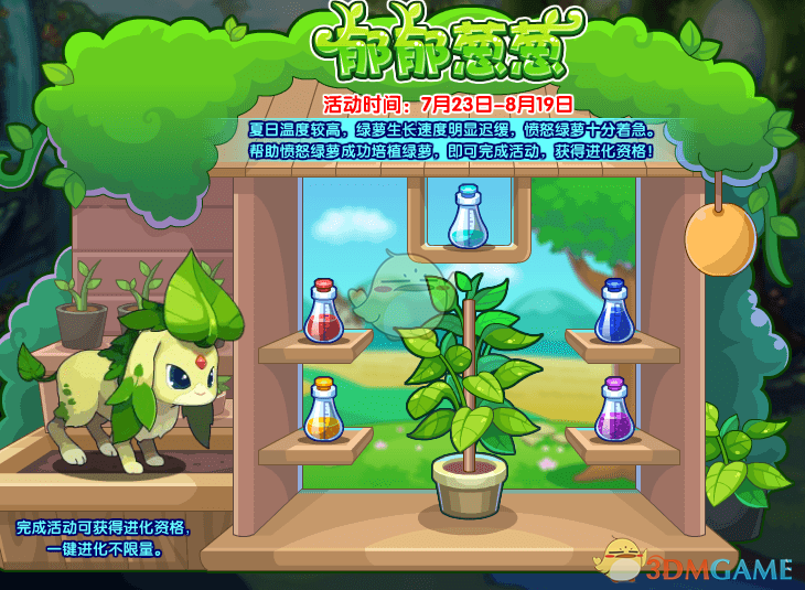 夏日温度较高,绿萝生长速度迟缓,愤怒绿萝十分着急。帮助愤怒绿萝成功培植绿萝,即可完成活动获得进化资格!