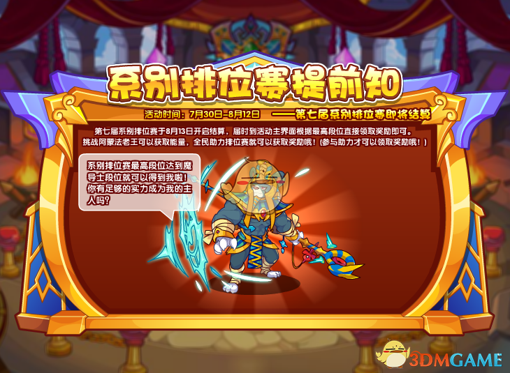 第七届系别排位赛于8月13日开启结算,届时到活动主界面根据最高段位直接领取奖励即可。挑战阿蒙法老王可以获取能量,全民助力排位赛就可以获取奖励哦!(参与助力才可以领取奖励哦!)