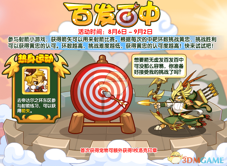 参与射箭游戏并挑战黄忠汉升,获得黄忠汉升的认可即可领取宠物,获得宠物:黄忠汉升。