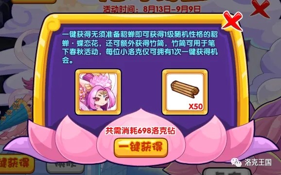 貂蝉·蝶恋花如果要通过一键获得方式获得,是不用提前准备宠物貂蝉的,一键获得貂蝉·蝶恋花的同时还会下发50个竹简,竹简可用于史小韵的《笔下春秋》活动。该获得方式仅限一次。