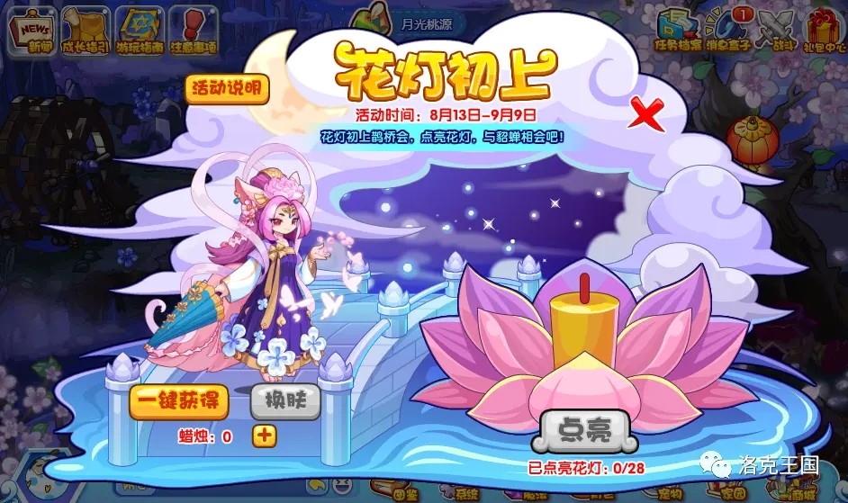 每点亮1次花灯需要消耗1根蜡烛,当点亮次数满足条件时,即可激活换肤。需要注意,换肤需要提前准备宠物貂蝉,且换肤后会直接将选择换肤的“貂蝉”替换为“貂蝉·蝶恋花”,宠物换肤后,等级、性格、天赋、培养值保留不变。