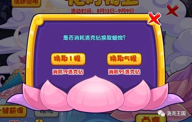 进入【花灯初上】活动后,点击【+】可通过洛克钻换取蜡烛,每19洛克钻可换取1根蜡烛。每点亮1次花灯需要消耗1根蜡烛,当点亮次数满足条件时,即可激活貂蝉·蝶恋花换肤。
