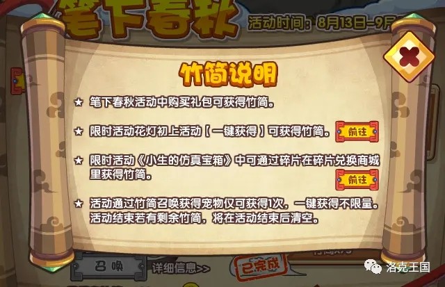 洛克王国游戏中史小韵可以通过【笔下春秋】活动获取!这里又分为两种获得方式:集齐竹简获得以及一键获得。其中通过集齐竹简获得史小韵仅限1次,一键获得的次数不限量。