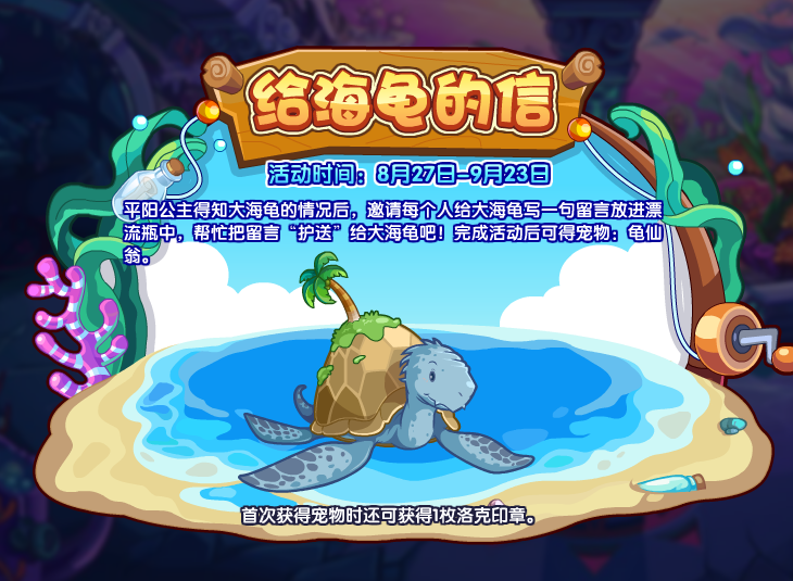 平阳公主得知大海龟的情况后,邀请每个人给大海龟写一句留言放进漂流瓶中,帮忙把留言“护送”给大海龟吧!完成活动可获得宠物:龟仙翁。