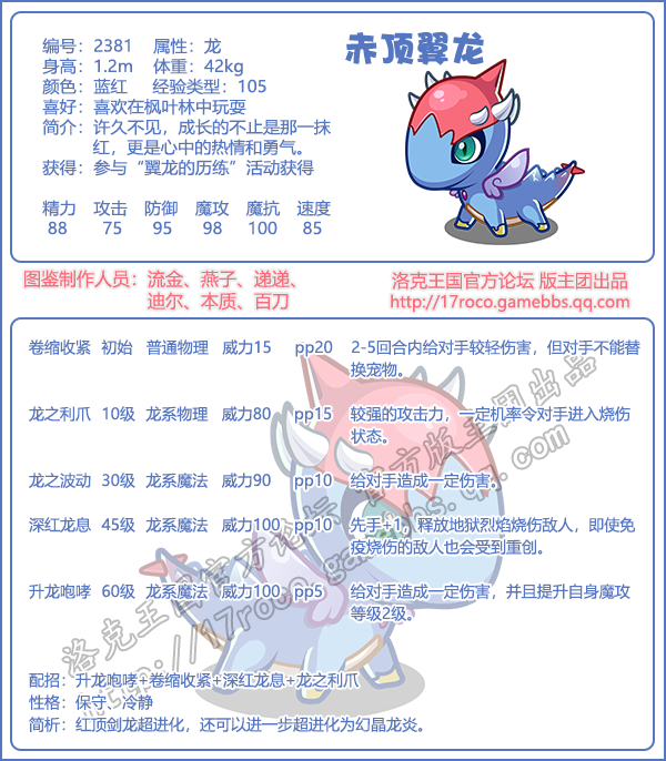 《洛克王国》是一款轻松好玩的休闲类手游,Q萌的游戏画风,玩家将被置身于一个精彩的世界中!游戏中拥有海量的宠物精灵,下面易采游戏网小编给大家带来了《洛克王国》赤顶翼龙技能表图鉴介绍,想要知道【赤顶翼龙】信息的小伙伴速来围观吧!