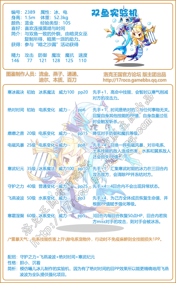 《洛克王国》是一款轻松好玩的休闲类手游,Q萌的游戏画风,玩家将被置身于一个精彩的世界中!游戏中拥有海量的宠物精灵,下面易采游戏网小编给大家带来了《洛克王国》双鱼实验机技能表图鉴介绍,想要知道【双鱼实验机】信息的小伙伴速来围观吧!