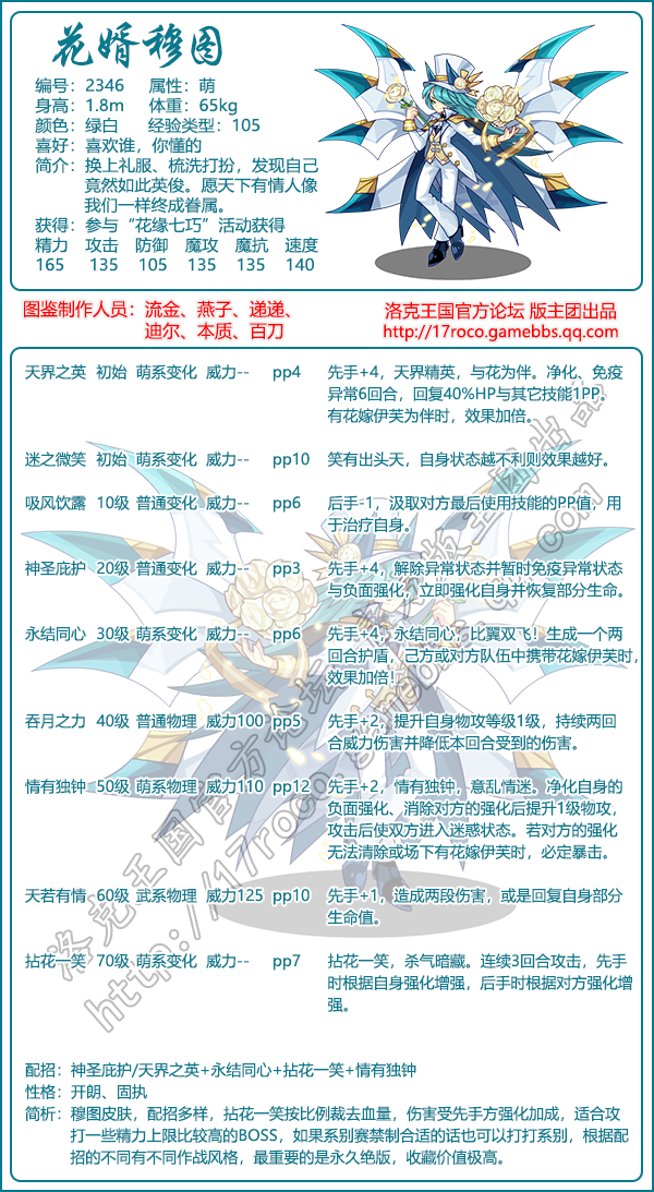 《洛克王国》是一款轻松好玩的休闲类手游,Q萌的游戏画风,玩家将被置身于一个精彩的世界中!游戏中拥有海量的宠物精灵,下面易采游戏网小编给大家带来了《洛克王国》花婿穆图技能表图鉴介绍,想要知道【花婿穆图】信息的小伙伴速来围观吧!