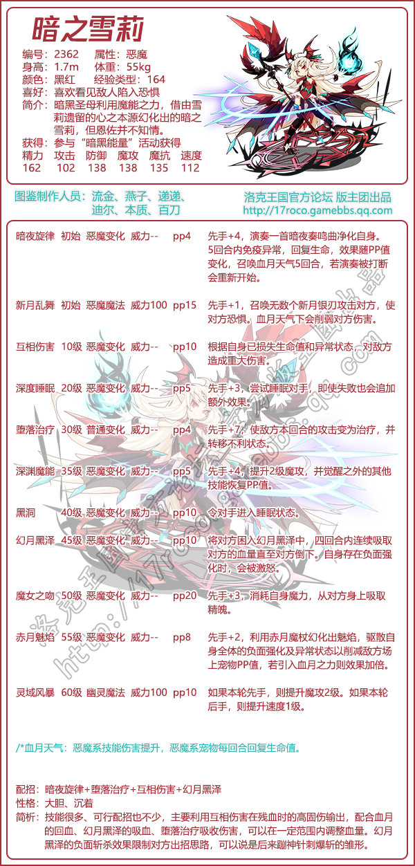 《洛克王国》是一款轻松好玩的休闲类手游,Q萌的游戏画风,玩家将被置身于一个精彩的世界中!游戏中拥有海量的宠物精灵,下面易采游戏网小编给大家带来了《洛克王国》暗之雪莉技能表图鉴介绍,想要知道【暗之雪莉】信息的小伙伴速来围观吧!