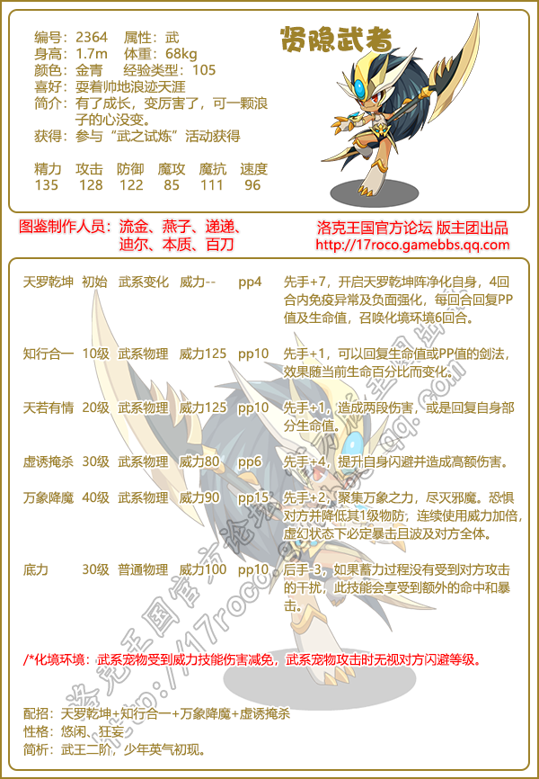 《洛克王国》是一款轻松好玩的休闲类手游,Q萌的游戏画风,玩家将被置身于一个精彩的世界中!游戏中拥有海量的宠物精灵,下面易采游戏网小编给大家带来了《洛克王国》贤隐武者技能表图鉴介绍,想要知道【贤隐武者】信息的小伙伴速来围观吧!