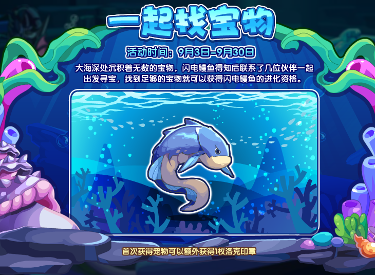 大海深处沉积着无数的宝物,闪电鳗鱼得知后联系了几位伙伴一起出发寻宝。找到足够的宝物就可获得闪电鳗鱼的进化资格。