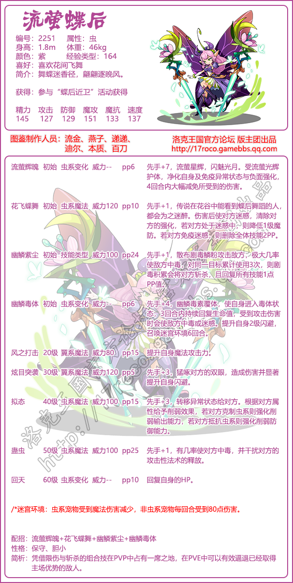 《洛克王国》是一款轻松好玩的休闲类手游,Q萌的游戏画风,玩家将被置身于一个精彩的世界中!游戏中拥有海量的宠物精灵,下面易采游戏网小编给大家带来了《洛克王国》流萤蝶后技能表图鉴介绍,想要知道【流萤蝶后】信息的小伙伴速来围观吧!