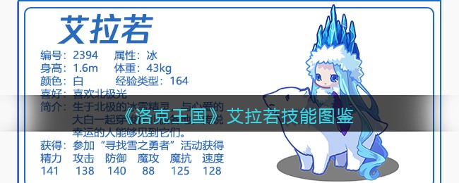 《洛克王国》是一款轻松好玩的休闲类手游,Q萌的游戏画风,玩家将被置身于一个精彩的世界中!游戏中拥有海量的宠物精灵,下面易采游戏网小编给大家带来了《洛克王国》艾拉若技能表图鉴介绍,想要知道【艾拉若】信息的小伙伴速来围观吧!