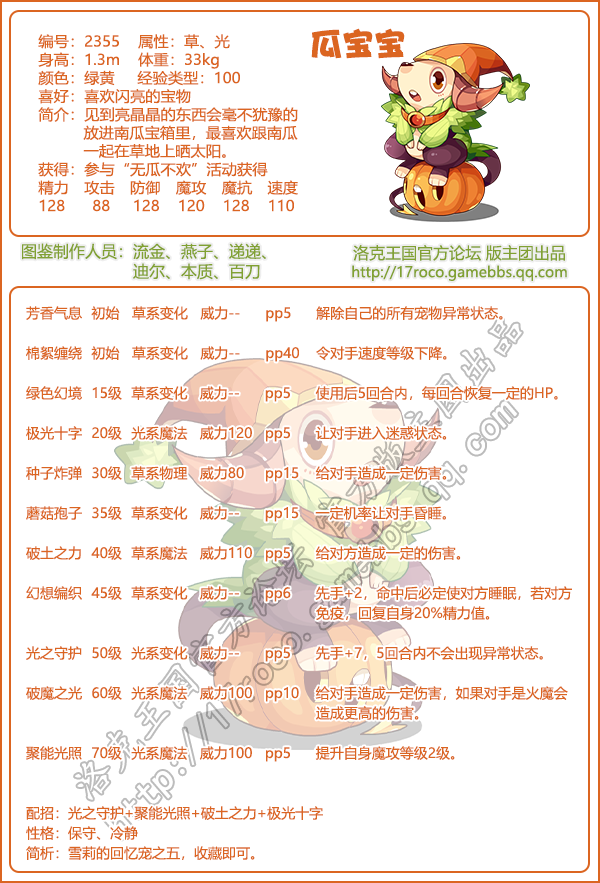 《洛克王国》是一款轻松好玩的休闲类手游,Q萌的游戏画风,玩家将被置身于一个精彩的世界中!游戏中拥有海量的宠物精灵,下面易采游戏网小编给大家带来了《洛克王国》瓜宝宝技能表图鉴介绍,想要知道【瓜宝宝】信息的小伙伴速来围观吧!