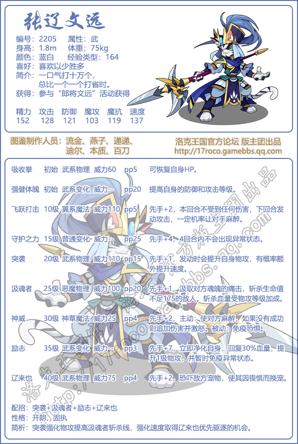 《洛克王国》是一款轻松好玩的休闲类手游,Q萌的游戏画风,玩家将被置身于一个精彩的世界中!游戏中拥有海量的宠物精灵,下面易采游戏网小编给大家带来了《洛克王国》张辽文远技能表图鉴介绍,想要知道【张辽文远】信息的小伙伴速来围观吧!