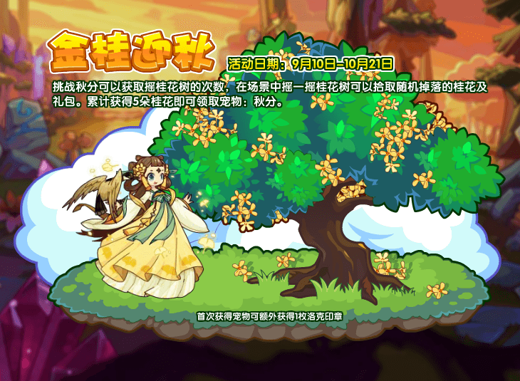 挑战秋分可以获取摇桂花树的次数,在场景中摇一摇桂花树可以拾取随机掉落的桂花及礼包。累计获得5朵桂花即可领取宠物:秋分。
