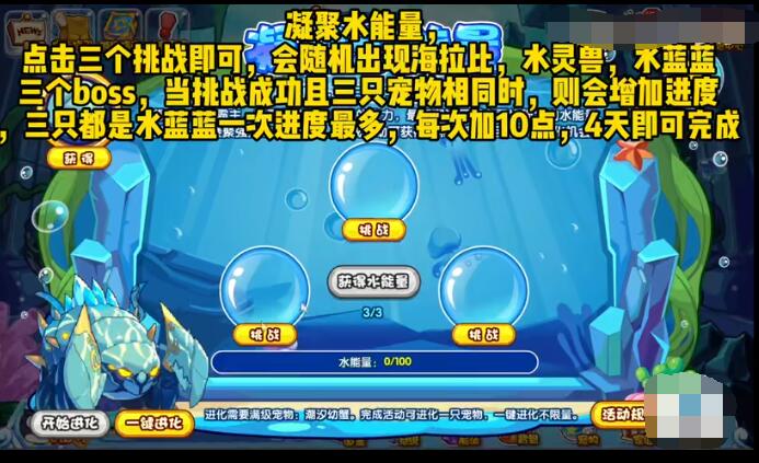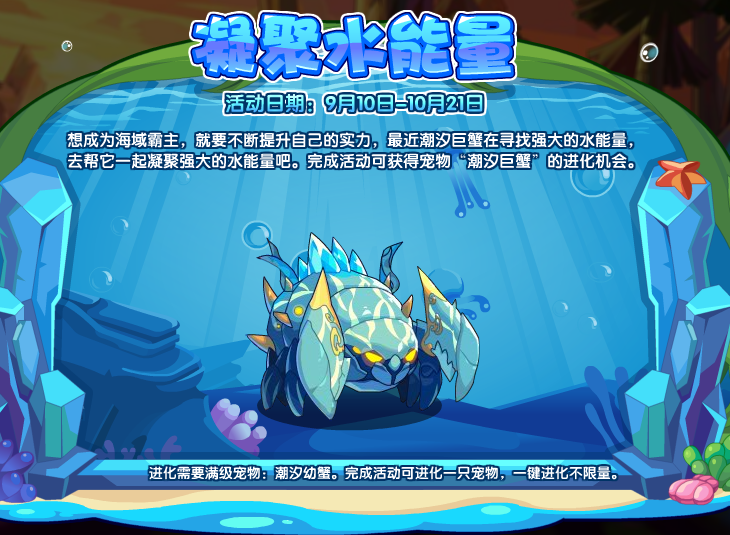 既想成为海域霸主,就要不断提升自己的实力,最近潮汐巨蟹在寻找强大的水能量,去帮它一起凝聚强大的水能量吧,完成活动可获得宠物“潮汐巨蟹”的进化机会。