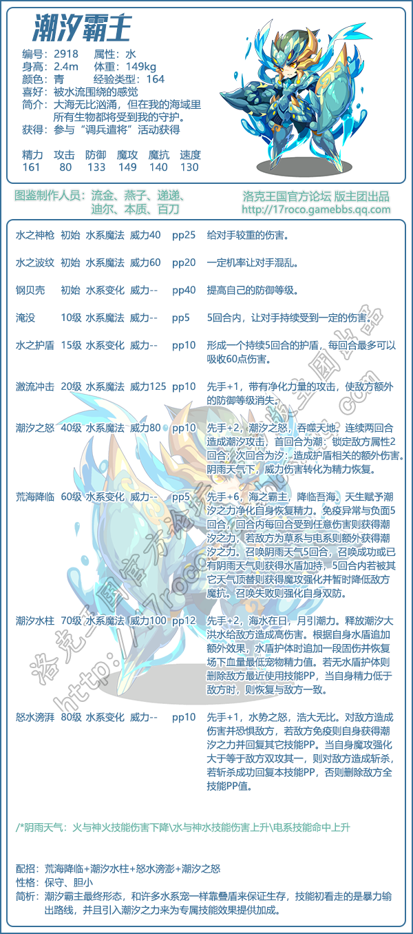 配招:荒海降临+潮汐水柱+怒水滂澎+潮汐之怒。潮汐霸主最终形态,和许多水系宠一样靠叠盾来保证生存,技能初看走的是暴力输出路,并且引入潮汐之力来为专属技能效果提供加成。