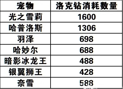 通过下边的翻页键可以看到各阶段的宠物的消耗洛克钻详情,详细的购买宠物及数量如下: