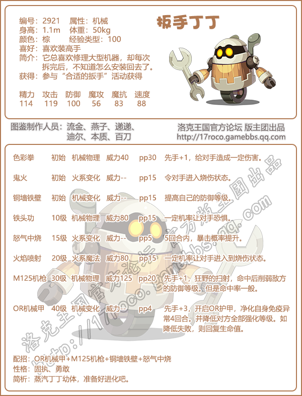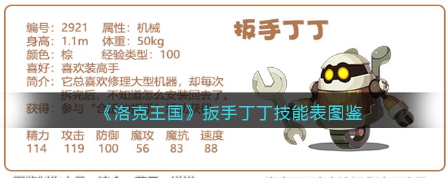《洛克王国》是一款轻松好玩的休闲类手游,Q萌的游戏画风,玩家将被置身于一个精彩的世界中!游戏中拥有海量的宠物精灵,【扳手丁丁】是下周五即将上线的新宠物,下面易采游戏网小编给大家带来了《洛克王国》扳手叮叮技能表图鉴介绍,想要知道该宠物信息的小伙伴速来围观吧!