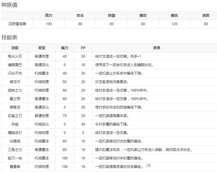 四肢雷鸣兽 精力100 攻击80 防御80 魔攻80 魔抗120 速度80