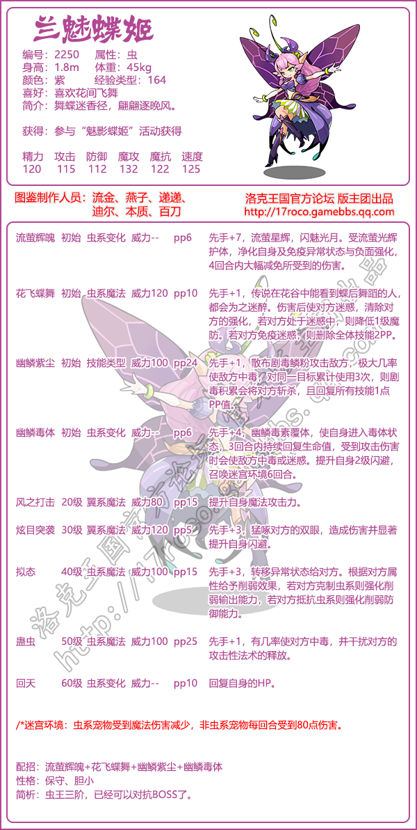 《洛克王国》是一款轻松好玩的休闲类手游,游戏中拥有海量的宠物精灵,兰魅蝶姬怎么样,厉害吗?下面易采游戏网小编给大家带来了《洛克王国》兰魅蝶姬技能表图鉴介绍,想要知道该宠物信息的小伙伴速来围观吧!