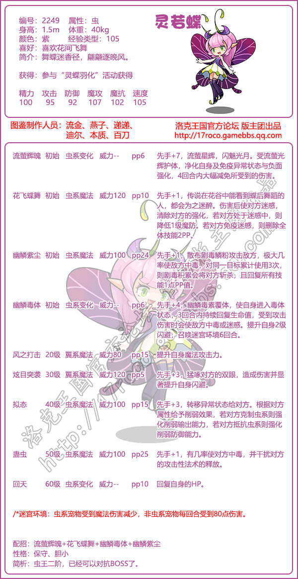 《洛克王国》是一款轻松好玩的休闲类手游,游戏中拥有海量的宠物精灵,灵若蝶怎么样,厉害吗?下面易采游戏网小编给大家带来了《洛克王国》灵若蝶技能表图鉴介绍,想要知道该宠物信息的小伙伴速来围观吧!